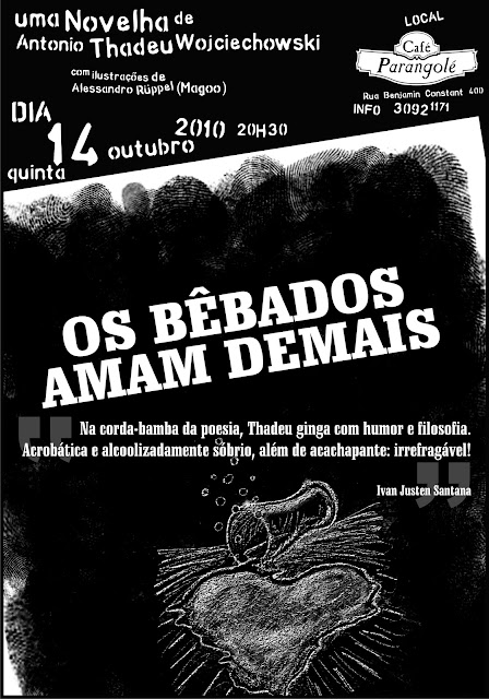 O escritor e compositor curitibano Antônio Thadeu Wojciechowski lança na próxima quinta-feira, dia 14 de outubro, o livro “Os Bêbados Amam Demais” no Café Parangolé. A obra, chamada pelo autor de “novelha” é uma ficção escrita em versos dodecassílabos e conta com a parceria de Alessandro Ruepel, o Magoo, como ilustrador.